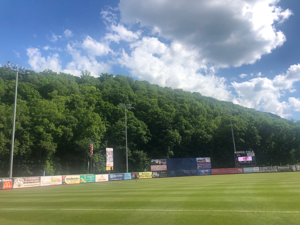 The Flyboys made their first overnight road trip of the season. The 1-1 club loaded the team bus Saturday morning for the 146 mile trek from Greenville to Bluefield, Va. We will play a two game set against the Ridge Runners. The city of Bluefield sits along the Bluestone River and is home to Bluefield State College as well. The town has a population of about 5,000 and I think all of them were at a carnival that was snuggled up to the baseball stadium. The stadium is called Bowen Field. The park was originally built in 1939 during the Great Depression. It was renovated in 1975. It holds 3000 and the seats were once those of the Anaheim Angels. The backdrop here is rather unique, surrounded by trees.